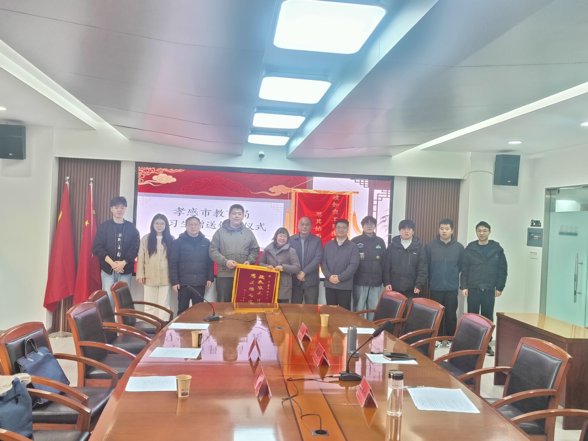 为表达感激之情,实习生团队向孝感市教育局赠送了题有“政如农工日夜思之 思其始而成其终”的锦旗。这面锦旗不仅传递了实习生对教育局前辈深耕教育、履职尽责的敬佩,更浓缩了全体实习生的感恩之心,成为校地协同育人的生动见证。