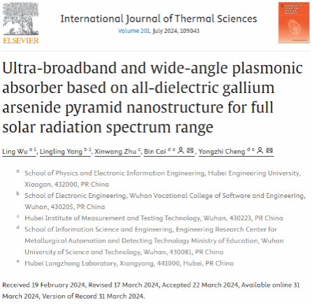 近日,bw必威西汉姆联官方网站吴玲副教授提出了一种结构简单新颖且高效的超宽带等离子体吸波器设计。研究成果以 “Ultra-broadband and wide-angle plasmonic absorber based on all-dielectric gallium arsenide pyramid nanostructure for full solar radiation spectrum range” 为题发表在上著名学术期刊《International Journal of Thermal Sciences》上,并入选科睿唯安ESI高被引及热点论文。