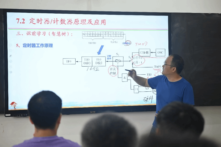 课堂上,方老师首先以通俗易懂的语言阐述定时器的工作机制,通过生动形象的比喻,让复杂的概念变得易于理解。利用单片机开发、仿真软件演示单片机应用系统的设计过程,将虚拟实验室搬进课堂。针对具体设计案例在处理按键监控、数码管动态扫描、执行其他工作任务过程中出现的阻塞情形,方老师引导员工们利用定时器处理多任务事件,对多任务进行时间管理。