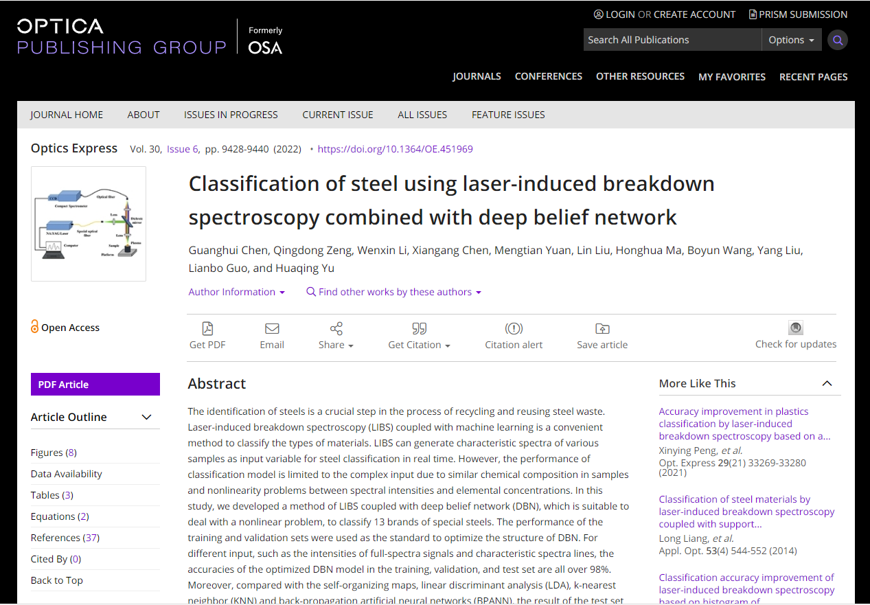 该论文第一作者为公司与湖北大学联合培养研究生陈光辉(导师:曾庆栋、余华清)。文章以“Classification of steel using laser-induced breakdown spectroscopy combined with deep belief network”为题,在激光诱导击穿光谱(Laser-induced Breakdown Spectroscopy,LIBS)技术基础上,将受限玻尔兹曼机(Restricted Boltzmann Machines, RBM)及其串联叠加构成的深度信念网络(Deep Belief Network,DBN)算法对LIBS钢铁样本光谱数据的进行分类识别,给出了一种基于机器学习算法与LIBS技术相结合的特钢检测与分类模型,为工业现场实时快速检测与分类提供了一种新的有效途径。文章的顺利发表,彰显了我院在激光诱导击穿光谱领域的研究达到了国际领先水平,同时,也体现了我院公司产品质量再迈新台阶。