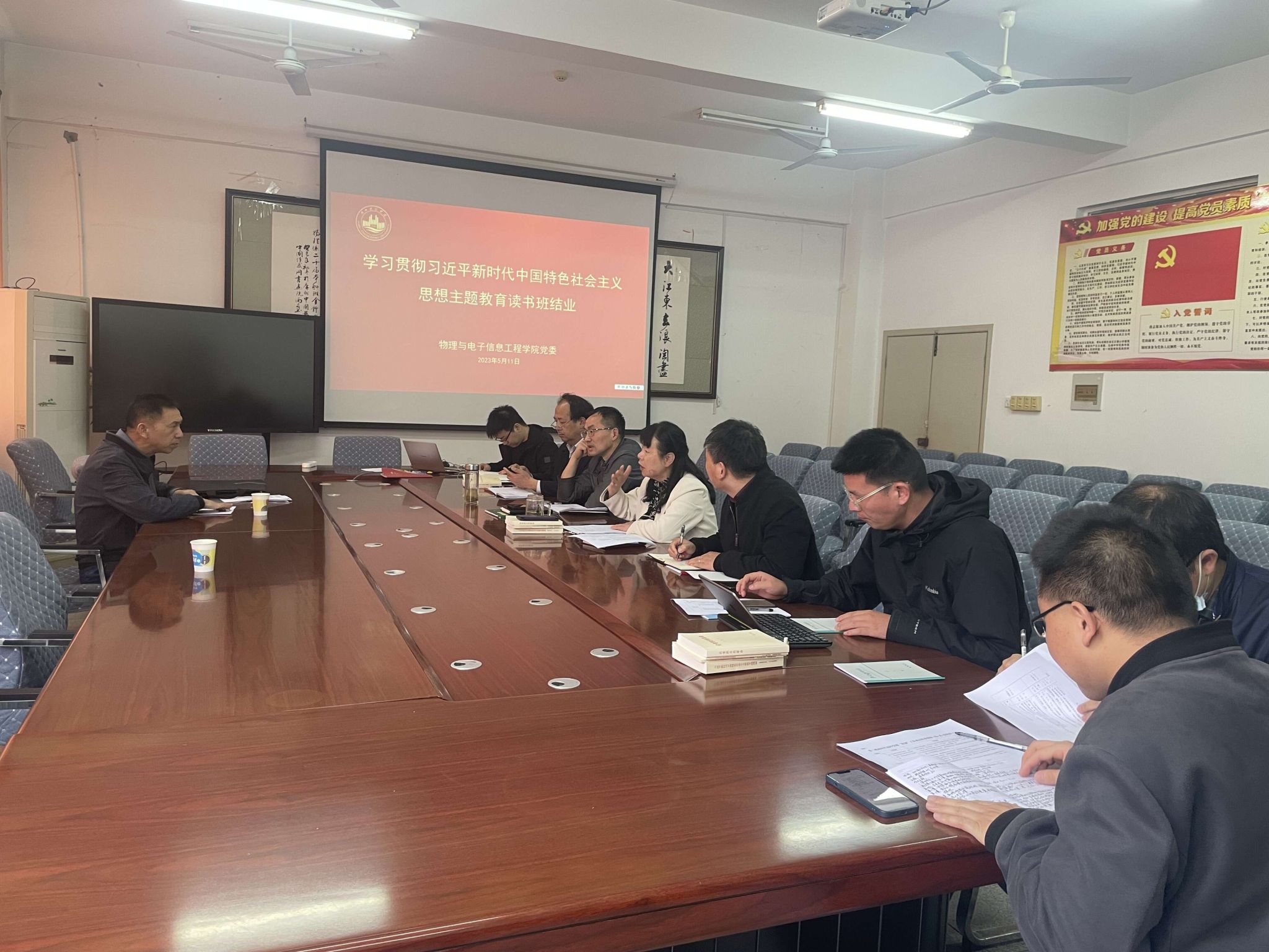 本网讯 5月11日,公司在格物楼209会议室举行学习贯彻习近平新时代中国特色社会主义思想主题教育读书班专题研讨交流暨主题教育读书班结业式。公司主题教育第五督导组组长殷近平,全体班子成员,党委委员参加。结业式由党委书记来秀明主持。