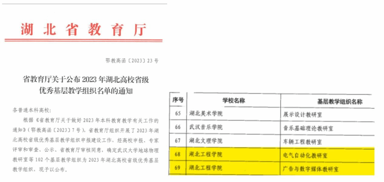 本网讯 近日,湖北省教育厅发布了《省教育厅关于公布2023年度省级优秀基层教学组织认定结果的通知》,公司张升义老师负责的电气自动化教研室获批省级优秀基层教学组织。这一荣誉是对公司教学质量和教师团队建设的肯定,也凸显了公司领导对基层教学组织建设的重视。
