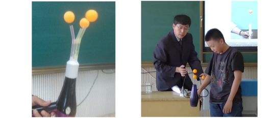 教具设计:在吹风机上安装三根吸管,用吹风机吹球。