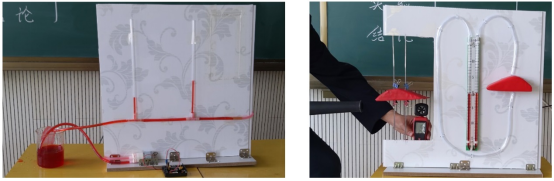 出示实验装置:接通电源,水泵吸水,观察两液面的高度差(如图16)。